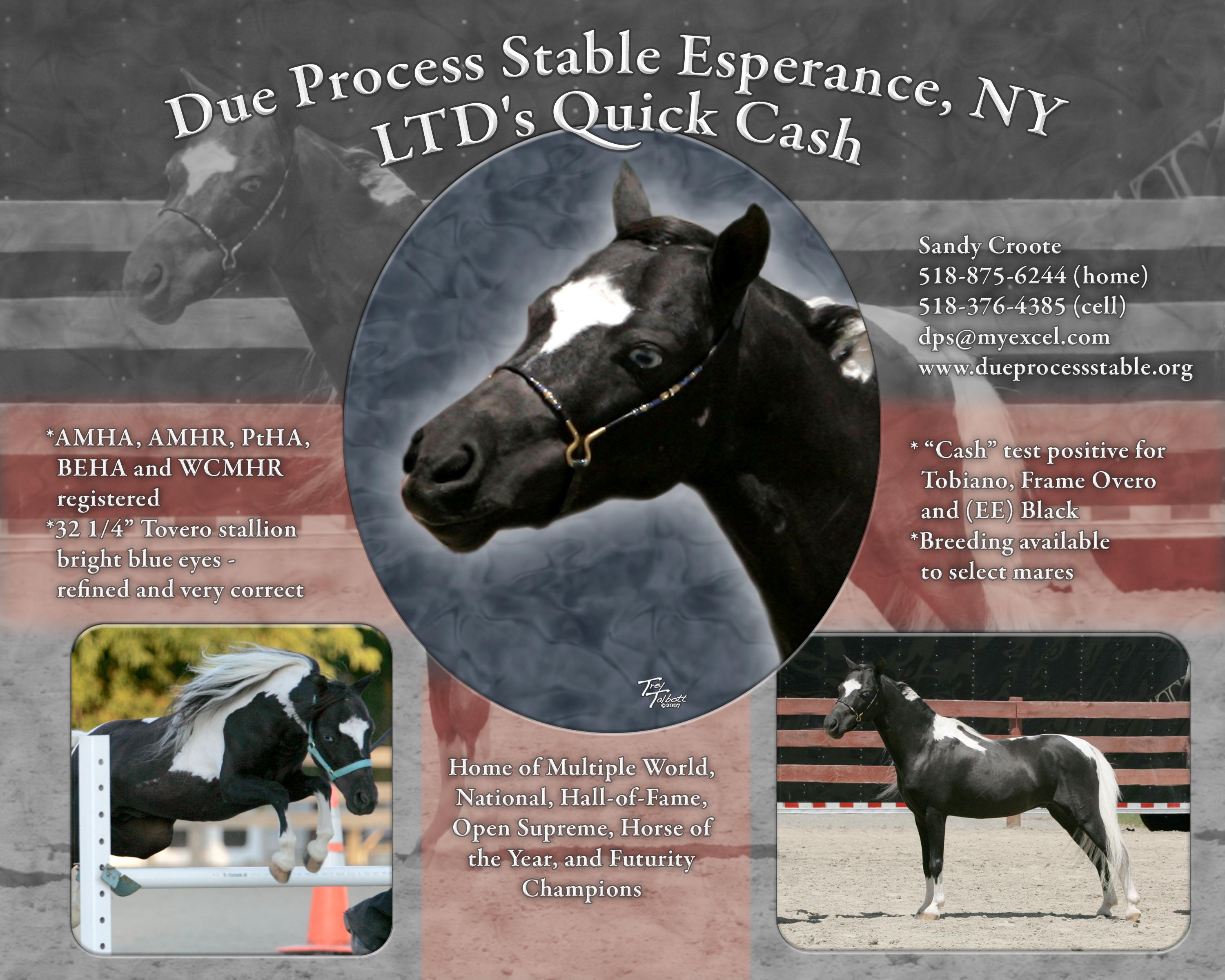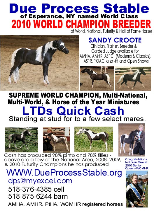 Cash debuted in driving in (2007) and having only shown a few months I was very pleased with his progress. A brillantly fast learner, and a pleasure to train, he really enjoys new things and the attention. 2010 SUPREME World Champion Sire & A Stallion 2010 ESHMA Overall CHAMPION Hi Point Performance 2007, 2008 & 2009 PtHA GYMKHANA HORSE of the YEAR 2008 A Halter Stallion HORSE OF THE YEAR - PtHA 2009 AMHR National Ar 1 Res GRAND CHAMP A Stallion |