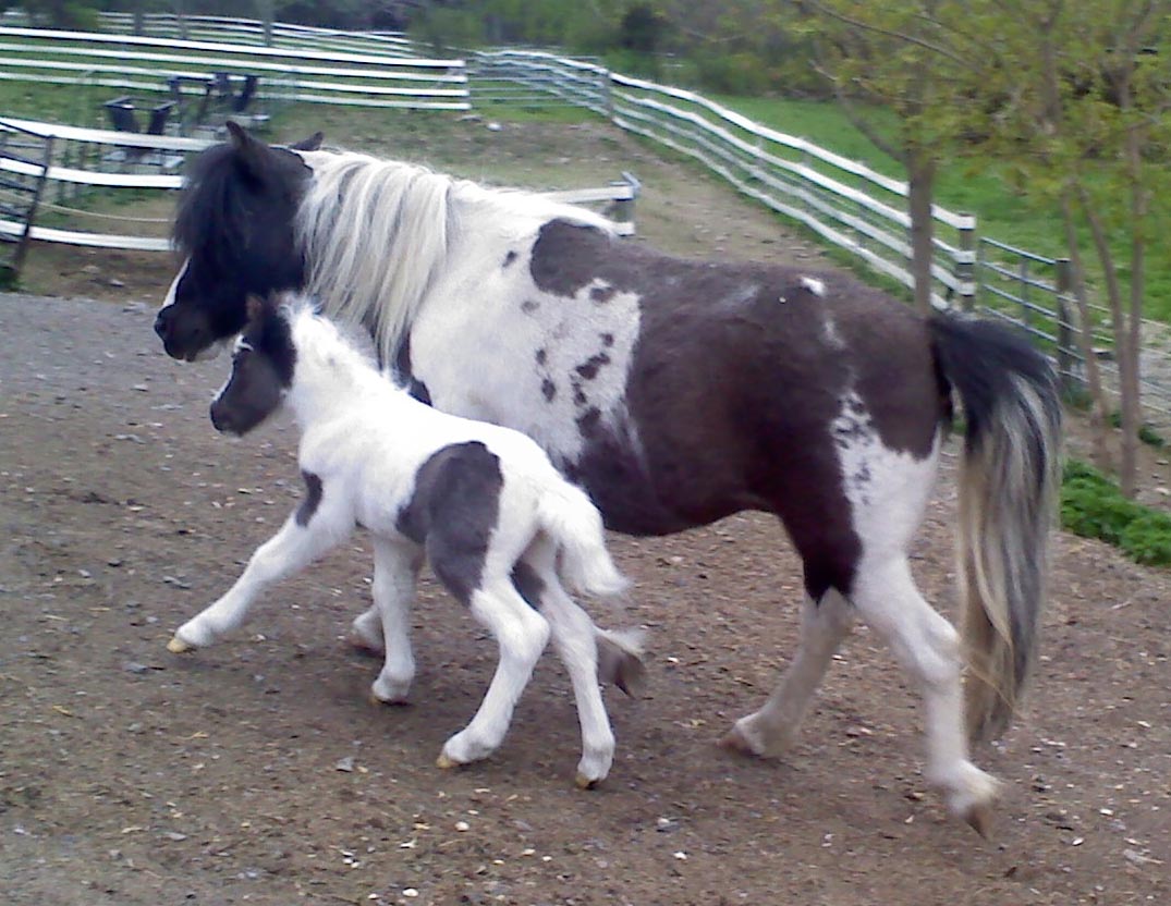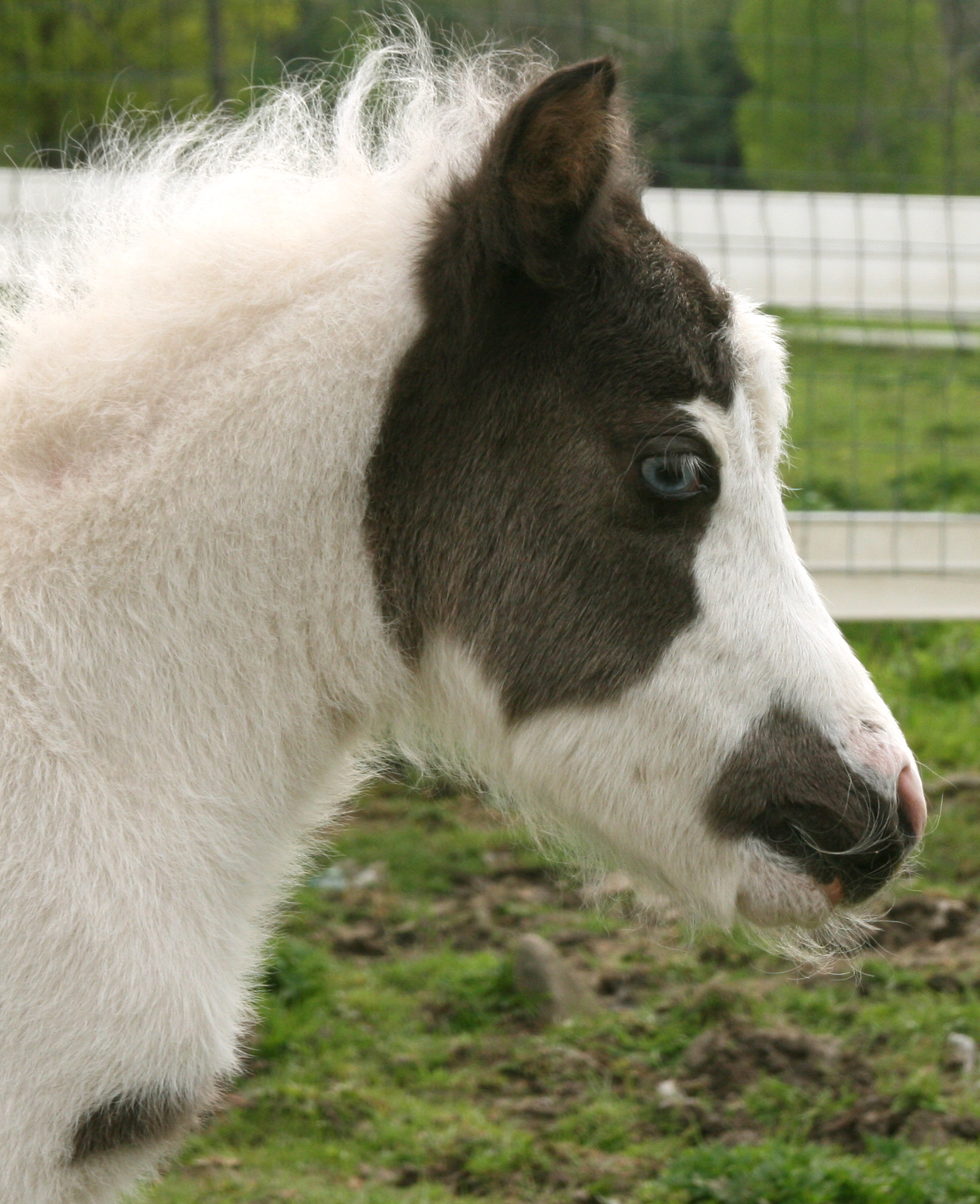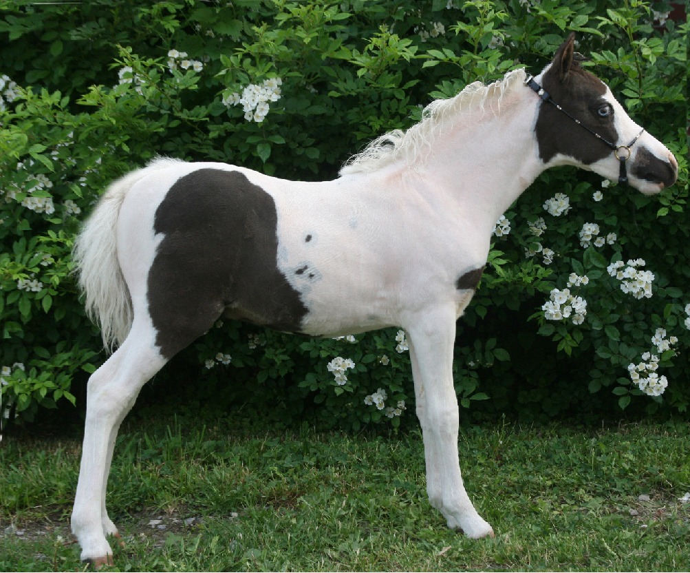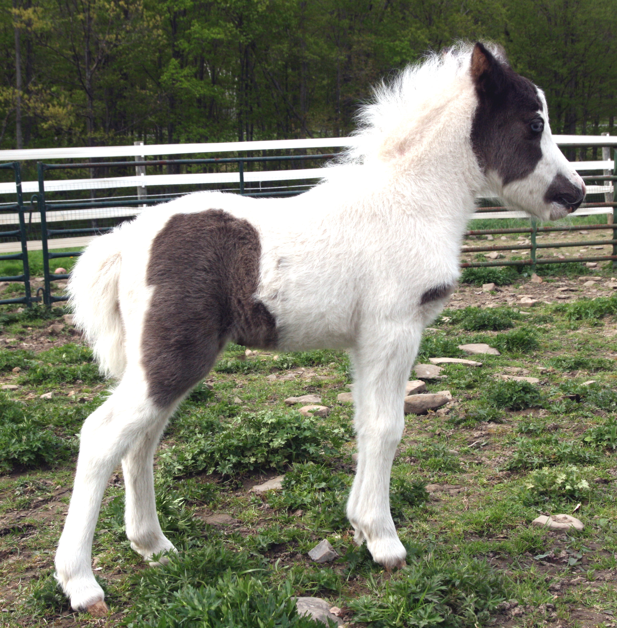 | Out of AMHR National Area 1 Top Ten Broodmare KFME Miss Hersey and World and National Champion Stallion LTD's Quick Cash - this little guy will mature to around 33". At days old, he has style and presence, and with pawprints he DNA tested HOMOZYGOUS (and as an added bonus, carries the Overo gene). Outstanding little show horse or your next herd sire. FOR SALE: $2500 |
