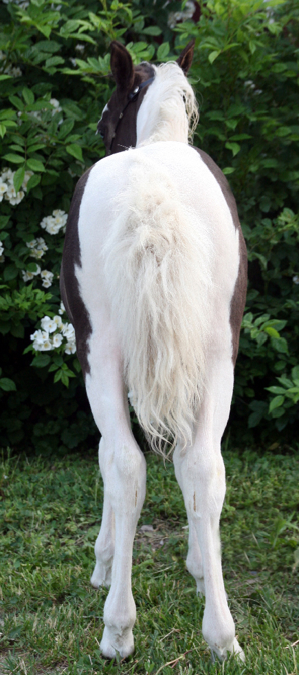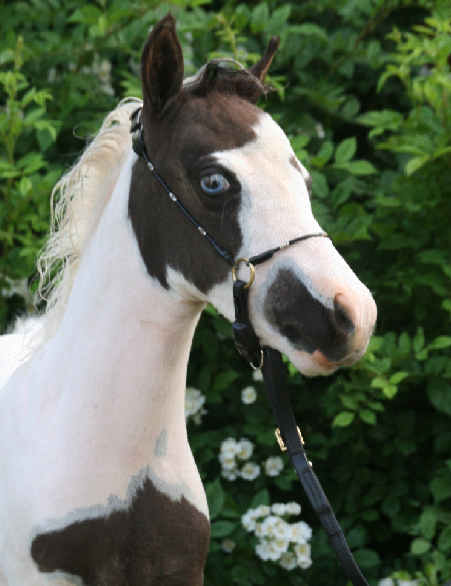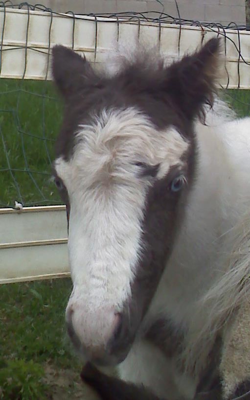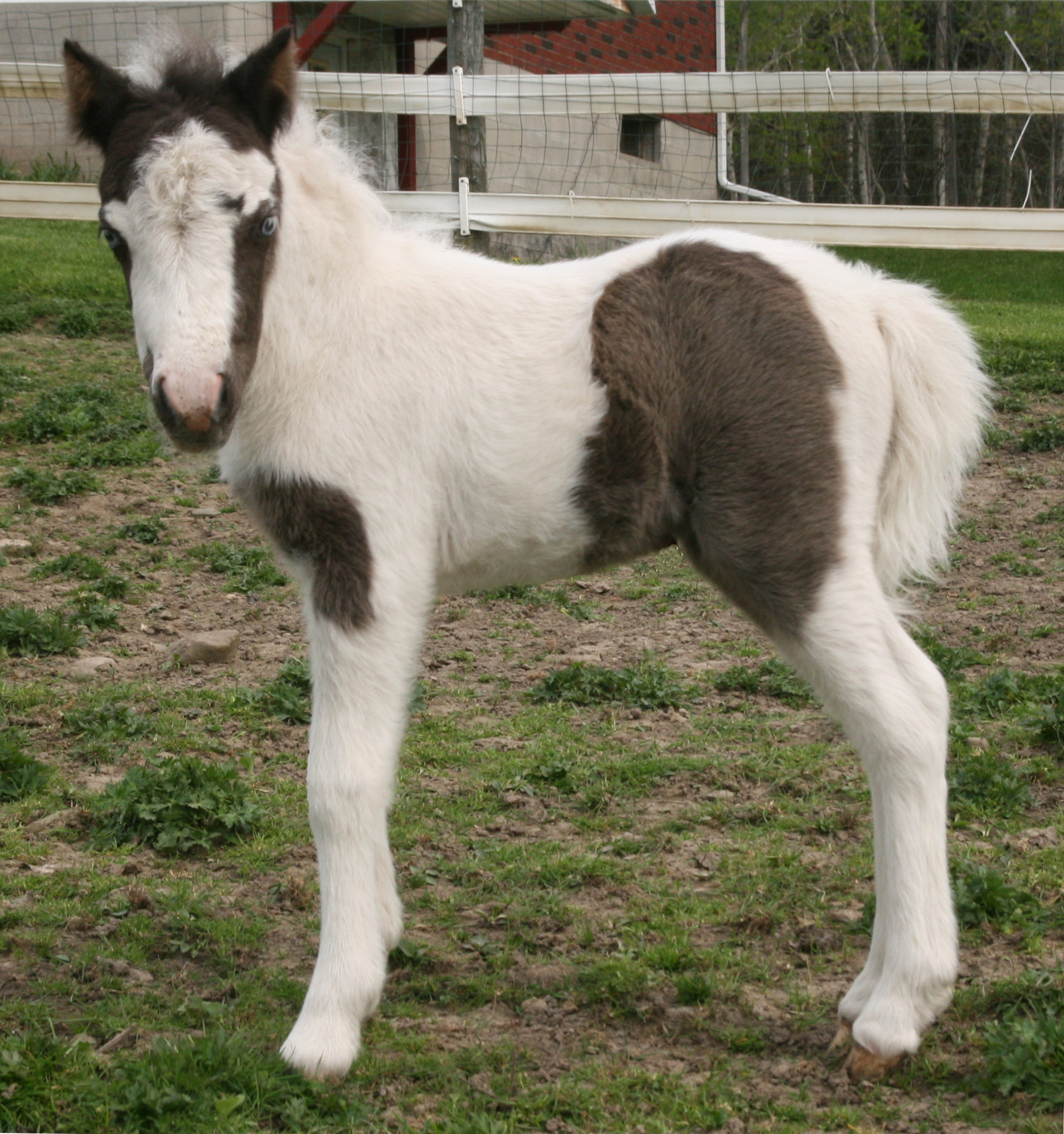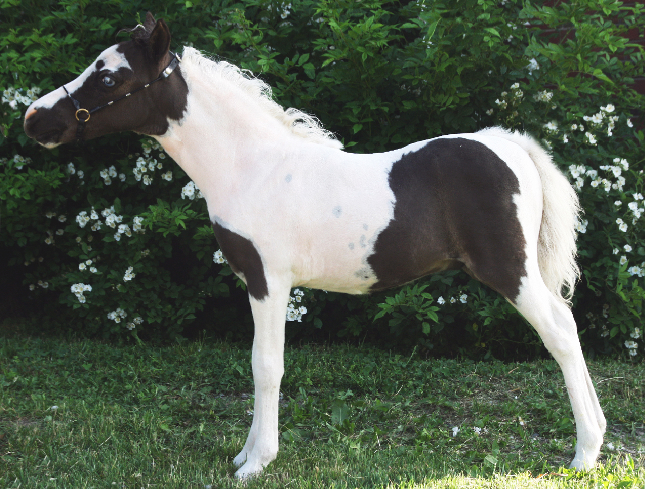 | Out of AMHR National Area 1 Top Ten Broodmare KFME Miss Hersey and World and National Champion Stallion LTD's Quick Cash - this little guy will mature to around 33". At days old, he has style and presence, and with pawprints he DNA tested HOMOZYGOUS (and as an added bonus, carries the Overo gene). Outstanding little show horse or your next herd sire. FOR SALE: $2500 |